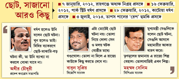 শিল্পমহলের কাছে রাজ্যের ভাবমূর্তি বাঁচানোর চেষ্টা করা দূরস্থান, উল্টে জামুড়িয়ায় তৃণমূলের কিছু নেতার তোলাবাজি ও হুমকি দেওয়াকে নেহাতই ‘ছোট ঘটনা’ বলে মন্তব্য করলেন মুখ্যমন্ত্রী মমতা বন্দ্যোপাধ্যায়। ওই ঘটনায় শ্যাম গোষ্ঠীর তরফে তিন দিন আগে থানায় লিখিত অভিযোগ করা হলেও নানা আইনি যুক্তি দেখিয়ে অভিযুক্তদের বিরুদ্ধে কোনও ব্যবস্থাই নেয়নি বর্ধমানের পুলিশ। মুখ্যমন্ত্রীর মন্তব্যের পরে তারা আরও গুটিয়ে গিয়েছে।