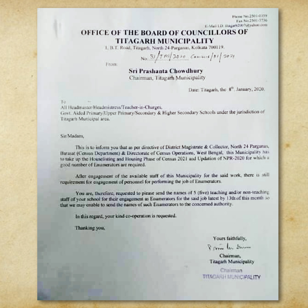 টিটাগড় পুরসভার তরফেও ওই এলাকার স্কুল কর্তৃপক্ষদের উদ্দেশে একই নির্দেশ দেওয়া হয়েছে। তাতে বলা হয়েছে, যাঁরা জনগননা এবং এনপিআর ‘আপডেট’-এর কাজ করবেন, তাঁদের নাম যেন দ্রুত পাঠানো হয়। ওই বিজ্ঞপ্তিতেও টিটাগড় পুরসভার চেয়ারম্যান প্রশান্ত চৌধুরির সই রয়েছে।শুধু তাই নয়, সেনসাস এবং এনপিআর কর্মসূচি দ্রুত কার্যকর করতে নির্দেশিকা এসেছে উত্তর ২৪ পরগনার জেলাশাসক এবং ডিরেক্টর অ্যান্ড চিফ প্রিন্সিপাল সেনসাস অফিস থেকেও। এ বিষয়ে প্রশান্তবাবু যুক্তি দিয়েছিলেন, “জেলাশাসকের অফিস থেকে নির্দেশ এসেছে। সে কারণে এই নোটিস। সাধারণ বিষয়। করতে বলছে, তাই করেছি। যেমন প্রত্যেক বার হয়। বাড়ি বাড়ি গিয়ে জনগণনা হবে। জেলাশাসকের দফতর থেকেই আমাদের কাছে কাগজ দিয়েছে।”