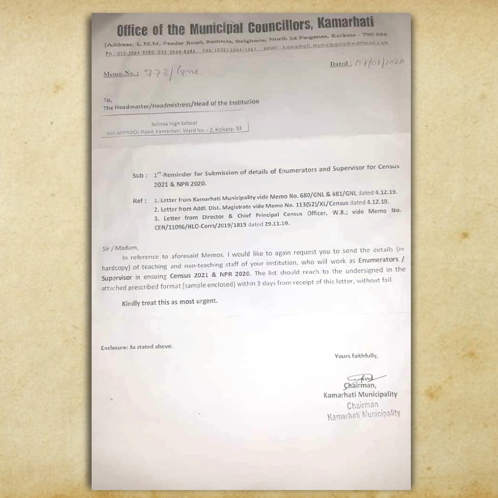 সম্প্রতি উত্তর ২৪ পরগনার কামারহাটি এবং টিটাগড় পুরসভা এনপিআর এবং জনগণনা (সেনসাস)-র বিষয়ে একটি নির্দেশিকা জারি করে। কী ছিল ওই বিজ্ঞপ্তিতে? বাড়ি বাড়ি গিয়ে তথ্য সংগ্রহের বিষয়ে গত ৭ জানুয়ারি একটি বিজ্ঞপ্তি জারি করেছে কামারহাটি পুরসভা। সেখানে পুরসভার চেয়ারম্যান গোপাল সাহার সই-ও রয়েছে। ওই বিজ্ঞপ্তিতে এলাকার বিভিন্ন স্কুল কর্তৃপক্ষ এবং প্রধান শিক্ষকদের উদ্দেশে বলা হয়েছে, জরুরি ভিত্তিতে শিক্ষক এবং অশিক্ষককর্মীদের তালিকা দিতে হবে, যাঁরা জনগণনা এবং এনপিআর-এর জন্য কাজ করবেন।