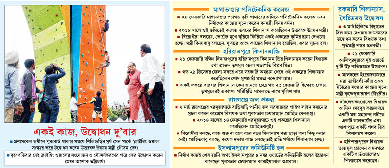 কোচবিহার থেকে চাঁচল শিলান্যাসের হিড়িক থেকে বাদ যাচ্ছে না নর্দমার গার্ড ওয়াল থেকে বাতিস্তম্ভও। হরিশ্চন্দ্রপুরের গত সপ্তাহে একটি নর্দমার গার্ড ওয়ালের শিলান্যাস হয়েছে, আবার আলিপুরদুয়ার শহরের একটি লম্বা বাতিস্তম্ভের উদ্বোধন অনুষ্ঠানও দেখেছেন শহরবাসী। বাসিন্দাদের একাংশের দাবি, সারা বছরই এমন অনেক কাজ চলতেই থাকে, ভোটের মুখে জনপ্রতিনিধিরা কাজ দেখাতে ছোট প্রকল্পের শিলান্যাস বা উদ্বোধনী অনুষ্ঠানও করছেন ঘটা করে। উত্তরবঙ্গের সাত জেলার ছোট-বড় সব শিলান্যাস প্রকল্প ধরলে গত দু’সপ্তাহে ৫০ কোটি টাকা ছাড়িয়ে গিয়েছে বলে প্রশাসনিক কর্তাদের দাবি। মন্ত্রী থেকে শুরু করে বিধায়ক, পুরসভা থেকে জেলা পরিষদ-গ্রাম পঞ্চায়েত সব দফতরই একাধিক প্রকল্পের উদ্বোধন-শিলান্যাস অনুষ্ঠান চলছে।
