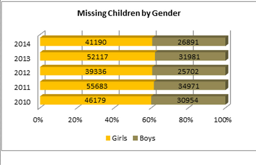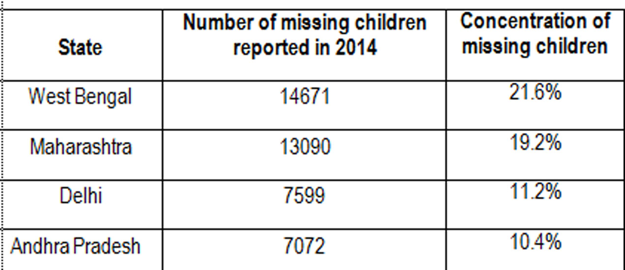 ২০১৪ সালে, শুধু পশ্চিমবঙ্গ থেকেই ১৪ হাজার ৬৭১টি শিশু-নিখোঁজের ঘটনা নথিভুক্ত হয়েছে। যা, ওই বছর সারা দেশে নিখোঁজ শিশুদের ২১.৬ শতাংশ। তার মানে, সারা দেশে নিখোঁজ শিশুদের প্রতি পাঁচ জনের এক জনই এই পশ্চিমবঙ্গের বাসিন্দা।