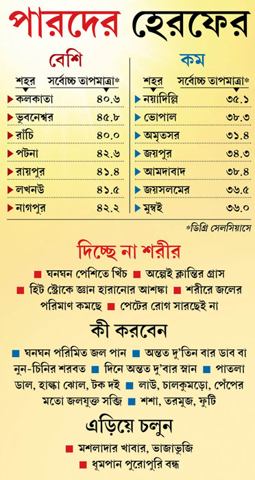 প্রকৃতির রথ স্বাভাবিক সড়কে গড়ালে এমনটা হওয়ার কথাই নয়। বছরের এই সময়টায় সাধারণত রোদের তাপে পুড়ে যায় রাজস্থান, গুজরাত, মধ্য ভারত, উত্তরপ্রদেশ ও হরিয়ানা। এ বার কিন্তু ওই সব রাজ্যে কোনও তাপপ্রবাহ নেই। আবহাওয়ার ঠিক উল্টো অবস্থান পূর্ব ভারতে। তিন দিন ধরে তাপপ্রবাহ চলছে ছত্তীসগঢ়, বিহার, ওড়িশা ও ঝাড়খণ্ডে।