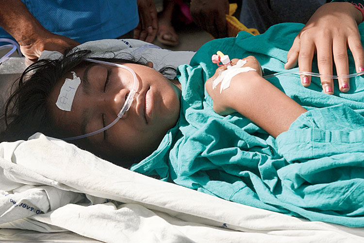 হাসপাতালের শয্যায় বর্ষা বিশ্বাস। শুক্রবার, ন্যাশনাল মেডিক্যাল কলেজ হাসপাতালে। ছবি: সুমন বল্লভ