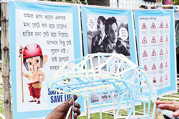 মা দুগ্গা কৈলাসে ফিরে গেলেও এ পুজো মণ্ডপে গণেশ এখনও থেকে গিয়েছেন। তাঁর মাথাতেও হেলমেট। তিনি আবার সতর্ক করছেন, ‘‘আমার ভাগ্য ভাল। এক বার মাথা কেটে বাদ হয়ে গেলেও হাতির মাথা সেট হয়ে গিয়েছে। আপনার কিন্তু সেই সুযোগ নেই। তাই হেলমেট ব্যবহার করুন।’’