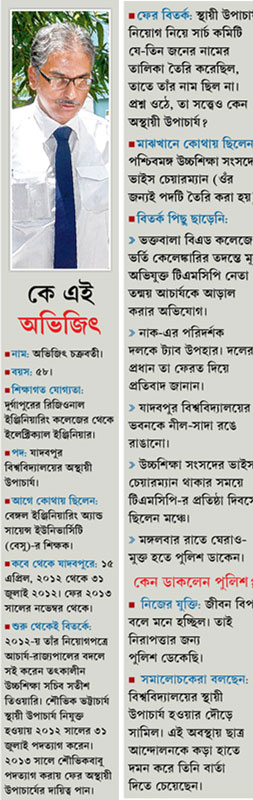 পুলিশি ঘেরাটোপে মঙ্গলবার গভীর রাতে বাড়ি ফেরার পরে বুধবার সকালে অসুস্থ বোধ করছিলেন যাদবপুর বিশ্ববিদ্যালয়ের উপাচার্য অভিজিৎ চক্রবর্তী। সল্টলেকের একটি বেসরকারি হাসপাতালের ডাক্তারেরা তাঁকে পরীক্ষা করেন। তাঁর রক্তচাপ বেশি (১৫০/১০০)। উপাচার্য বললেন, “বুক ধড়ফড় করছে। মাথায় যন্ত্রণা। ডাক্তারেরা ৫-৬ দিন বিশ্রাম নিতে বলেছেন।” সেই সঙ্গে কিছু প্রশ্নের উত্তরও দিলেন তিনি।