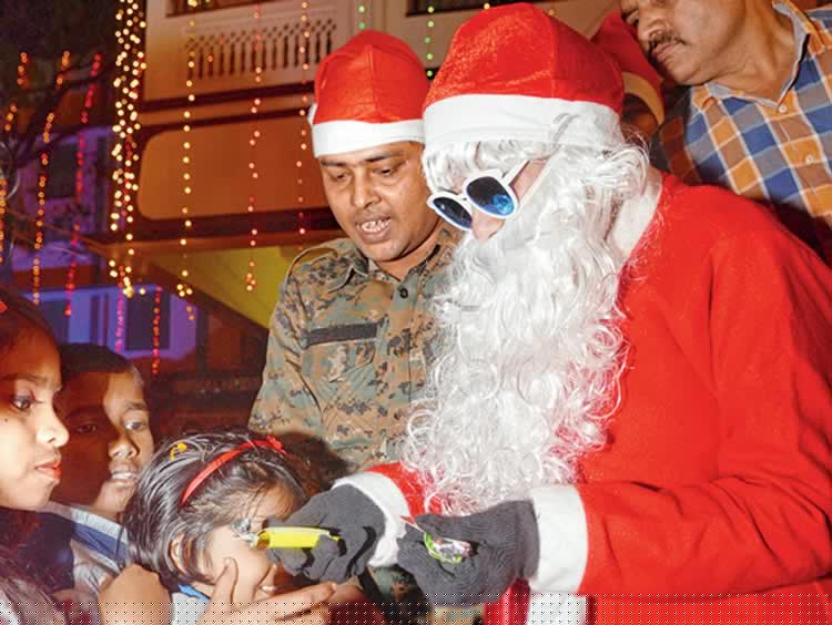 বড়দিনে সান্তার সাজে ভারতী ঘোষ। মেদিনীপুর ক্যাথলিক গির্জার সামনে। ফাইল চিত্র।