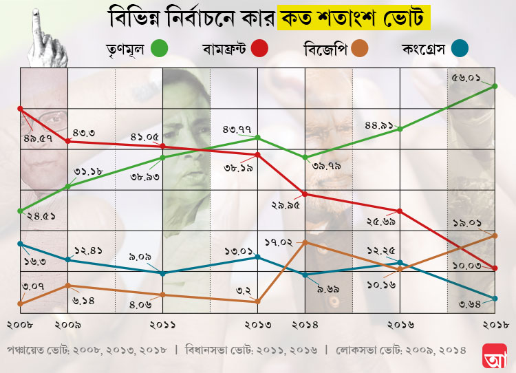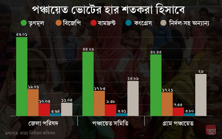 তৃণমূল ৩৪ শতাংশের আশপাশে। আর বিজেপি প্রায় ২৮ শতাংশ। পঞ্চায়েত নির্বাচনের সবচেয়ে কাছাকাছি পৌঁছে যে জনমত সমীক্ষা প্রকাশ্যে এসেছে, তাতে এই রকমই ইঙ্গিত ছিল।