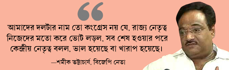 শমীক ভট্টাচার্য অবশ্য সে জল্পনা নস্যাৎ করার চেষ্টা করলেন। বললেন, ‘‘আমাদের দলটার নাম তো কংগ্রেস নয় যে, রাজ্য নেতৃত্ব নিজেদের মতো করে ভোট লড়ল, সব শেষ হওয়ার পরে কেন্দ্রীয় নেতৃত্ব বলল, ভাল হয়েছে বা খারাপ হয়েছে। আমাদের দলে তো রাজ্য নেতৃত্বের সঙ্গে জাতীয় নেতৃত্ব নিরন্তর যোগাযোগের মধ্যে রয়েছেন। পঞ্চায়েতের লড়াইয়ে রাজ্য যতটা সামিল ছিল, জাতীয় নেতৃত্বও তো ততটাই। কে কাকে আলাদা করে অভিনন্দন জানাবে বুঝতে পারছি না।’’
