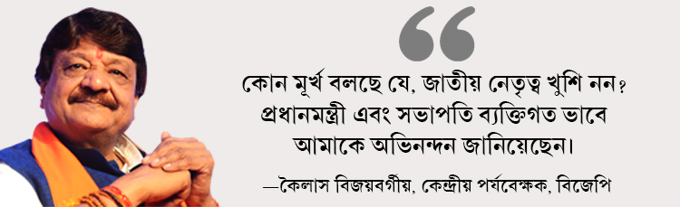 সবচেয়ে কড়া বয়ানটা এল সর্বভারতীয় নেতৃত্বের প্রতিনিধির কাছ থেকেই। দিল্লির তরফ থেকে পর্যবেক্ষক হিসেবে বঙ্গ বিজেপির ভার সামলাচ্ছেন যিনি, কেন্দ্রীয় নেতৃত্বের অসন্তোষ সংক্রান্ত গুঞ্জন প্রসঙ্গ উঠতেই সেই কৈলাস বিজয়বর্গীয় পাল্টা প্রশ্ন ছুড়লেন, ‘‘কোন মূর্খ বলছে যে, জাতীয় নেতৃত্ব খুশি নন?’’ বিজয়বর্গীয় বললেন, ‘‘প্রধানমন্ত্রী এবং সভাপতি ব্যক্তিগত ভাবে আমাকে অভিনন্দন জানিয়েছেন। এই প্রচণ্ড হিংসার মধ্যে আমরা যে ফল করেছি, দু’জনেই তার প্রশংসা করেছেন।’’
