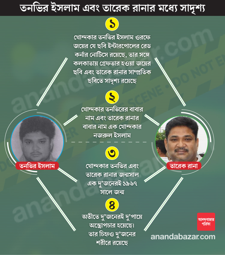 ১) ২০০৫ সালে খোন্দকার তনভির ইসলাম ওরফে জয়ের যে ছবি ইন্টারপোলের রেড কর্নার নোটিসে রয়েছে, তার সঙ্গে ২০০৭ সালে কলকাতায় গ্রেফতার হওয়া জয়ের ছবি এবং তারেক রানার সাম্প্রতিক ছবিতে সাদৃশ্য রয়েছে।