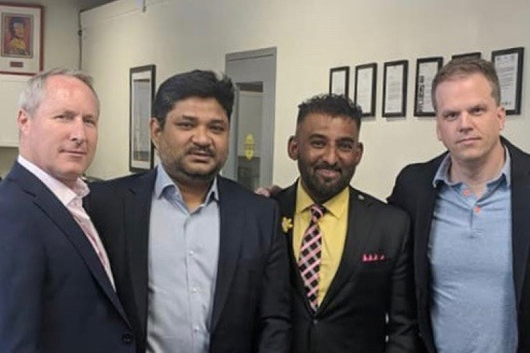 আয়াক্স শহরের মেয়র শন কোলিয়ার (বাঁ দিকে), কাউন্সিলর আসমিদ খান (ডান দিক থেকে দ্বিতীয়) লিবারেল এমপি মার্ক হল্যান্ডের সঙ্গে তারেক রানা। ছবি মার্ক হল্যান্ডের ফেসবুক থেকে সংগৃহীত।