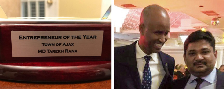লিবারেল এমপি আহমেদ হুসেনের সঙ্গে তারেক রানা। ওই সময়ে হুসেন ছিলেন অভিবাসন দফতরের মন্ত্রী (ডান দিকে)। টাউন অব আয়াক্স থেকে তারেক রানাকে দেওয়া ২০১৮ সালের ‘অন্ত্রপ্রনর অব দ্য ইয়ার’ স্মারক (বাঁ দিকে)। ফেসবুক থেকে সংগৃহীত ছবি।
