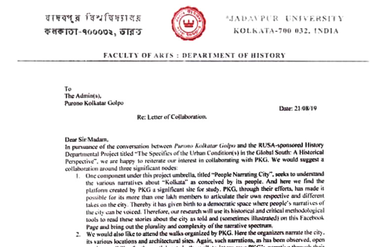 অনেকটা সেই দিক-নির্দেশ বেয়েই যেন এ বার ফেসবুক গ্রুপ থেকে ইতিহাসচর্চার উপাদান খুঁজে নিতে চাইছে যাদবপুর বিশ্ববিদ্যালয়ের ইতিহাস বিভাগ। কেন্দ্রীয় সরকারের ‘রাষ্ট্রীয় উচ্চতর শিক্ষা অভিযান (রুশা)’ প্রকল্পের অনুদানে যাদবপুরের ইতিহাস বিভাগে কলকাতার পুরনো চিঠি সংগ্রহ করা এবং জনতার বয়ানে কলকাতার কথা ধরে রাখার কাজ চলছে। এই দু’টি প্রকল্পের কাজে শামিল হতে ইতিহাস বিভাগ চিঠি দিয়ে অনুরোধ করেছে ‘পুরনো কলকাতার গল্প’ নামে লক্ষাধিক সদস্যসম্বলিত ফেসবুক গ্রুপকে।