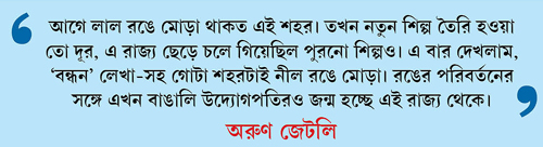 নীল রঙের প্রতি মমতা বন্দ্যোপাধ্যায়ের দুর্বলতার কথা কারও অজানা নয়। মুখ্যমন্ত্রীর ইচ্ছাতেই শহরের পথঘাট, সরকারি বাড়ি সেজেছে নীল-সাদা রঙে। ব্যক্তিগত বাড়িতে নীল-সাদা রং করলে কর ছাড়ের কথাও ঘোষণা করেছে কলকাতা পুরসভা। সেই শহরে দাঁড়িয়ে রবিবার জেটলি বললেন, এ বার কলকাতায় এসে বেশ ভাল একটি পরিবর্তন চোখে পড়েছে তাঁর। শহর ছেয়ে গিয়েছে নীল রঙে! তাঁর কথায়, ‘‘আগে যখন এসেছি, তখন লাল রঙে মোড়া থাকত এই শহর। সেই সময়ে নতুন শিল্প, নতুন সংস্থা তৈরি হওয়া তো দূরস্থান, এ রাজ্য ছেড়ে চলে গিয়েছিল পুরনো শিল্পও। দেখে ভাল লাগছে, রঙের পরিবর্তনের সঙ্গে এখন বাঙালি উদ্যোগপতির জন্ম হচ্ছে এই রাজ্য থেকে।’’