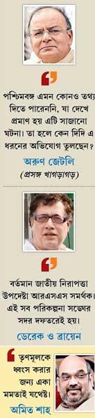 জেটলির এমন আক্রমণ তৃণমূল নেতৃত্বের কাছে কিছুটা অপ্রত্যাশিত। গত সপ্তাহে দিল্লি সফরে এসে মমতা যে তিন বিজেপি শীর্ষ নেতার সঙ্গে দেখা করেছিলেন, তার মধ্যে ছিলেন কেন্দ্রীয় অর্থমন্ত্রী। মমতা একে সৌজন্য সাক্ষাৎকার বললেও বিরোধীরা তা নিয়ে কটাক্ষ করতে ছাড়েননি। সেই জেটলি আজ রীতিমতো কড়া সুরেই আক্রমণ করেছেন মমতাকে। তাঁকে ‘মমতাদিদি’ সম্বোধন করেও জেটলি লিখেছেন, “এনআইএ ইতিমধ্যেই একাধিক লোককে গ্রেফতার করেছে। তারা দেশের শত্রু। পশ্চিমবঙ্গের সরকার বা গোয়েন্দারা এমন কোনও তথ্য দিতে পারেননি, যা দেখে প্রমাণ হয়, এটি সাজানো ঘটনা। যদি এমন কোনও প্রমাণ না-ই থাকে, তা হলে কেন দিদি এ ধরনের অভিযোগ তুলছেন?” মমতার মন্তব্য দায়িত্বজ্ঞানহীন ও দেশবিরোধী বলে আখ্যা দিয়ে জেটলি ব্লগে লিখেছেন, “এই ধরনের অভিযোগ আসলে প্রকৃত অপরাধীদের সাহায্য করে।”