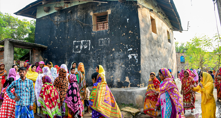 বাসিরুল সরকারের বাড়ির বাইরে ভিড় গ্রামের বাসিন্দাদের। ছবি: এপি।
