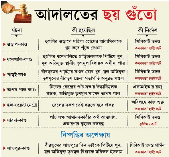 বীরভূমের পাড়ুইয়ে সংগঠিত সাগর ঘোষ হত্যা সংক্রান্ত মামলার রায় দিতে গিয়ে বুধবার তৃণমূলের বীরভূম জেলা সভাপতি অনুব্রত মণ্ডলকে আড়াল করার জন্য রাজ্য পুলিশকে দুষেছে কলকাতা হাইকোর্ট। খোদ রাজ্য পুলিশের ডিজি’র উপরে চরম অনাস্থা প্রকাশ করে বিচারপতি পাড়ুই-তদন্তের ভার সঁপেছেন সিবিআইয়ের হাতে। আর বৃহস্পতিবার কৃষ্ণনগরের তৃণমূল সাংসদ তাপস পালের উস্কানি-উক্তি সংক্রান্ত মামলায় হাইকোর্ট পুলিশি নিষ্ক্রিয়তার নালিশকেই মান্যতা দিয়ে সাংসদের বিরুদ্ধে এফআইআর দাখিল করতে বলেছে। পর পর দু’দিনের এ হেন জোড়া ধাক্কাতেই অস্বস্তির পালা