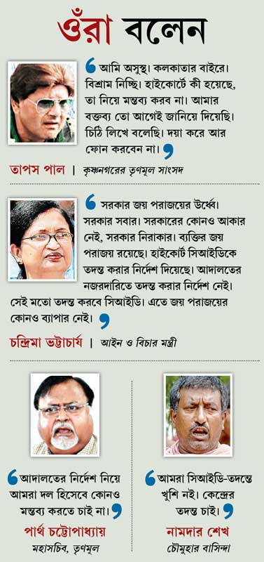 যোগাযোগ করা হলে তাপসবাবু এ দিন জানান, তিনি অসুস্থ, কলকাতার বাইরে বিশ্রাম নিচ্ছেন। হাইকোর্টের রায় প্রসঙ্গে মন্তব্য এড়িয়ে তৃণমূল সাংসদের প্রতিক্রিয়া, “আমি তো আমার বক্তব্য আগেই জানিয়ে দিয়েছি! চিঠি লিখে বলেছি। দয়া করে আর ফোন করবেন না।” তাপসবাবুর দলের তরফে তৃণমূলের মহাসচিব পার্থ চট্টোপাধ্যায় বলেন, “আদালতের নির্দেশ নিয়ে আমরা দল হিসেবে কোনও মন্তব্য করতে চাই না।” আর রাজ্য সরকারের তরফে আইন ও বিচারমন্ত্রী চন্দ্রিমা ভট্টাচার্যের প্রতিক্রিয়া, “সরকার জয়-পরাজয়ের ঊর্ধ্বে। সরকার সকলের। হাইকোর্ট সিআইডি’কে তদন্ত করার নির্দেশ দিয়েছে। আদালতের নজরদারিতে তদন্ত করার নির্দেশ নেই। সেই মতো তদন্ত করবে সিআইডি।” বিরোধীরা স্বভাবতই হাইকোর্টের রায়কে হাতিয়ার করেছে। বিজেপির রাজ্য সভাপতি রাহুল সিংহের কটাক্ষ, “রাজ্য সরকার ফের আদালতে চপেটাঘাত খেল। রায়ে স্পষ্ট, আদালত তাপসবাবুকে প্রাথমিক ভাবে দোষীই মনে করছে।”