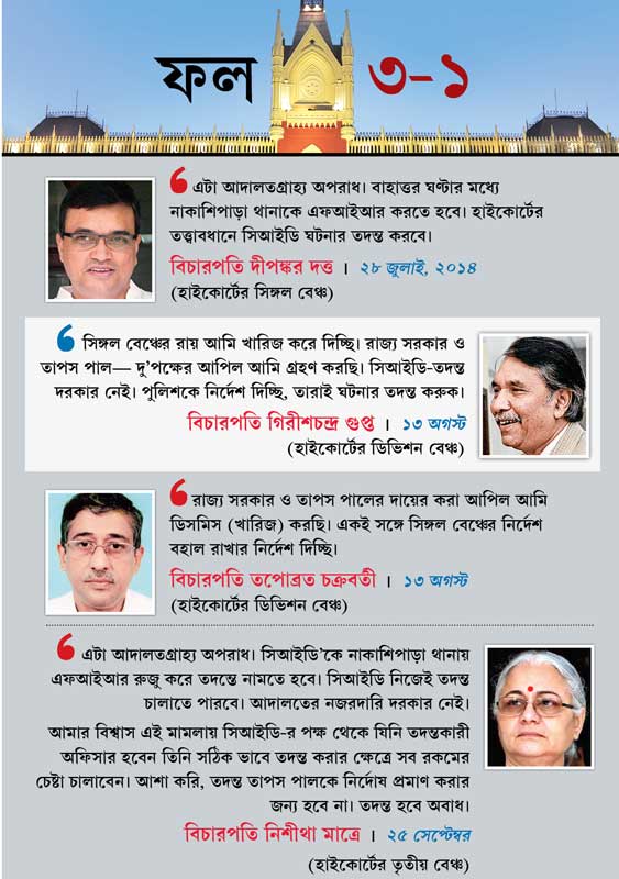 গত ১৪ জুন তাপস পাল তাঁর লোকসভা কেন্দ্রের পাঁচ জায়গায় উস্কানিমূলক বক্তব্য পেশ করার পরেও পুলিশ সক্রিয় না-হওয়ায় এবং তাপসের উক্তির বিরুদ্ধে দাখিল অভিযোগগুলিকে এফআইআরের মর্যাদা না-দেওয়ায় বিরাটির এক বাসিন্দা হাইকোর্টে পুলিশি নিষ্ক্রিয়তার মামলা করেছিলেন। সিঙ্গল বেঞ্চ, ডিভিশন বেঞ্চ ঘুরে শেষমেশ তৃতীয় এক বিচারপতির এজলাসে যে ভাবে তার চূড়ান্ত নিষ্পত্তি হল, কলকাতা হাইকোর্টের ইতিহাসে তেমন নজির নেই বলেই দাবি করছেন আইনজীবীরা। তৃতীয় বিচারপতি মাত্রের এজলাসও শাসকদলের সাংসদের প্রতি রাজ্য প্রশাসনের ‘পক্ষপাত’ নিয়ে সংশয়ে ছিল। “মনে হচ্ছে, রাজ্যের ভূমিকা হল আড়াল করার। শাসকদলের সাংসদ বলেই কি সরকার ব্যাপারটা চাপা দিতে চাইছে?’’ ১০ সেপ্টেম্বর শুনানিতে প্রশ্ন তুলেছিলেন বিচারপতি মাত্রে। তাঁর এ-ও পর্যবেক্ষণ ছিল, “এখানে এখন সাধারণ লোকে ইন্টারনেটে কিছু আপলোড করলে পুলিশ ধরছে! আইনি ব্যবস্থা নিচ্ছে!” বস্তুত শাসকদলের সাংসদ হওয়ার সুবাদে তাপস পালের পক্ষে যে তদন্তকে প্রভাবিত করা বিলক্ষণ সম্ভব, বিচারপতি সেই আশঙ্কা প্রকাশ করেন। তিনি লেখেন, “আদালত চায়, তদন্ত দ্রুত সেরে ফেলা হোক।” এত কিছুর মূলে যিনি, তিনি কী বলছেন?