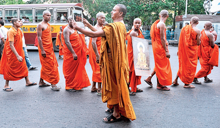 সেই উপলক্ষে শহরে একটি শান্তি পরিক্রমায় পা মেলালেন বৌদ্ধ সন্ন্যাসীরা। শনিবার। ছবি: সুমন বল্লভ।