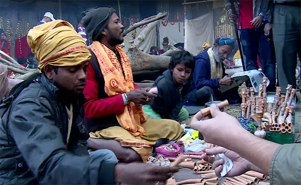ছাইমাখা গায়ে কেউ দোলনায় দুলছেন। কেউ রাগী মুখে তাকিয়ে। কেউ বা আবার দর্শণার্থীদের আর্শীবাদ করতে হাত তুলেছেন। আশপাশ থেকে ভেসে আসছে গাঁজার তীব্র গন্ধ। অনেকে ব্যস্ত আখড়ার স্মৃতি মোবাইলে বন্দি করতে। ভিড়ের মাঝেই এক পাশে চড়েছে দুপুরের রান্না। শহরের আউট্রাম ঘাটের কাছে এখন গঙ্গাসাগরমুখী মানুষের ভিড়। শেষ মুহূর্তের বাঁধাছাঁদা শেষ। এ বার রওনা দিতে হবে কপিলমুনির আশ্রমের কাছে গঙ্গাসাগর মেলায়। রাজ্যের নানা প্রান্ত থেকে তো বটেই, ভিড় জমিয়েছেন ভিন্ রাজ্যের ভক্তরাও। জমায়েতের ফাঁকেই চোখ ফেরালে নজরে পড়ে ইতিউতি পসরা ছড়িয়ে বসেছেন দোকানিরা। তার মাঝেই চোখ টানে কল্কেবাবার পসরায়। হরেক কিসিমের কল্কে সাজিয়ে বসেছেন তিনি। কী নেই সেখানে? একমুখী কল্কে, দু’মুখী কল্কে থেকে শুরু করে রয়েছে তিনমুখী বা পঞ্চমুখী কল্কে। মিলছে নানা দেবদেবী-সাপ জড়ানো কল্কেও। সবই দেবতাকে উত্সর্গের জন্য।
