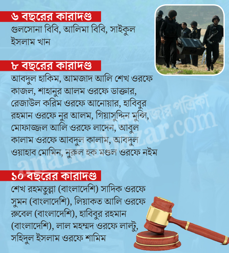 আদালত জানিয়েছে, বেআইনি কার্যকলাপ, ষড়যন্ত্র, বেআইনি অস্ত্র ও বিস্ফোরক মজুতের বিভিন্ন ধারায় ওই ১৯ জনকে শাস্তি দেওয়া হল। গ্রেফতারের পর থেকে ওই আসামিরা জেলেই আছেন। কারাদণ্ডের মোট মেয়াদ থেকে ইতিমধ্যে জেলে কাটানোর সময়টা বাদ যাবে। দণ্ডিতদের মধ্যে আছেন দুই মহিলা, এক ছাত্র এবং বাংলাদেশের কয়েক জন নাগরিক। কারাবাসের মেয়াদ শেষ হলে এবং দেশের অন্য কোনও আদালতে ওই বাংলাদেশিদের বিরুদ্ধে মামলা না-থাকলে তাঁদের দেশে ফেরানোর জন্য সংশ্লিষ্ট জেলের কর্তৃপক্ষকে নির্দেশ দিয়েছেন বিচারক।