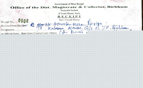 মন্ত্রীর জন্য সার্কিট হাউসের দু’টি ঘরে শনিবার সন্ধ্যা ৭টা থেকে পর দিন দুপুর ১টা পর্যন্ত থাকা ও খাওয়া বাবদ বিল করা হয়েছে মোট হাজার টাকা। এ দিন দুপুরে সিউড়ির প্রশাসনিক ভবনে বিজেপি-র জেলা সাধারণ সম্পাদক কালোসোনা মণ্ডলকে খবর পাঠিয়ে তাঁকে বিল দেওয়া হয়। সার্কিট হাউসের ঘরভাড়ার বিলটি (৪০০ টাকার) প্রথমে মন্ত্রীর নামে করা হলেও পরে তা কেটে কালোসোনাবাবুর নাম বসানো হয়েছে। সার্কিট হাউসে খাবারের দায়িত্বে যে কেটারার সংস্থা, তাদের বিলটি আবার মন্ত্রীর নামেই করা হয়েছে।