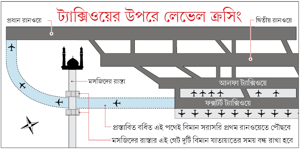 পরিকল্পনা অনুযায়ী, ট্যাক্সিওয়ে ও মসজিদের রাস্তার সংযোগস্থলে দু’দিকে লেভেল ক্রসিংয়ের ধাঁচে দু’টি গেট বসানো হবে। বিমানবন্দর কর্তৃপক্ষের হিসেব, ভোর সাড়ে পাঁচটা থেকে রাত ৯টার মধ্যে পাঁচ বার লোকজন মসজিদে যাতায়াত করেন। তাঁরা বাঁকড়ার গেট থেকে ট্যাক্সিওয়ে পর্যন্ত আসবেন। তখন বিমান যাওয়ার থাকলে লেভেল ক্রসিংয়ে অপেক্ষা করতে হবে তাঁদের। বিমান চলে যাওয়ার পর গেট খুলে গেলে তাঁরা মসজিদে চলে যাবেন। ফেরার পথে একই ব্যবস্থা। দু’দিকের গেটেই নিরাপত্তারক্ষীরা থাকবেন।
