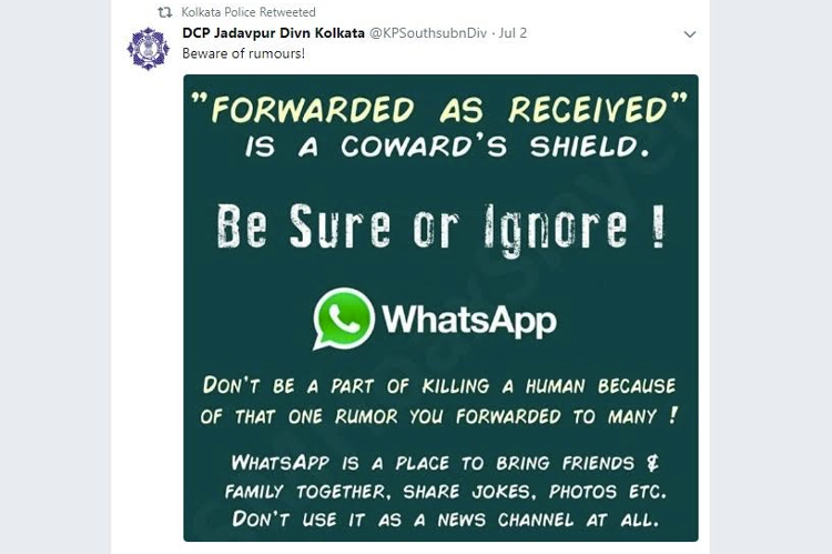 এর পাশাপাশি কলকাতা পুলিশের সোশ্যাল অ্যাকাউন্টে নিয়মিত প্রচার চালানো হচ্ছে সচেতনতা বাড়ানোর জন্য। সেখানে সম্প্রতি বার বার সাবধান করা হচ্ছে যাতে সোশ্যাল মিডিয়াতে পাওয়া কোনও তথ্য যাচাই না করে কেউ ফরোয়ার্ড বা শেয়ার না করেন।