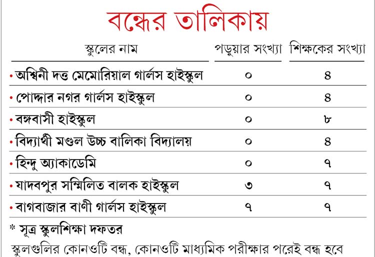 পড়ুয়া না থাকায় শেষ পর্যন্ত পাকাপাকি ভাবে বন্ধ হতে চলেছে কলকাতার ৭৫টি সরকার পোষিত বাংলা মাধ্যমের স্কুল! স্কুলশিক্ষা দফতর সূত্রের খবর, ইতিমধ্যে সেই প্রক্রিয়া শুরু হয়ে গিয়েছে। পড়ুয়া ও শিক্ষকদের কাছাকাছি অন্য স্কুলে পাঠানো হচ্ছে। এ সমস্ত স্কুলেই পঞ্চম থেকে দশম শ্রেণি পর্যন্ত রয়েছে।