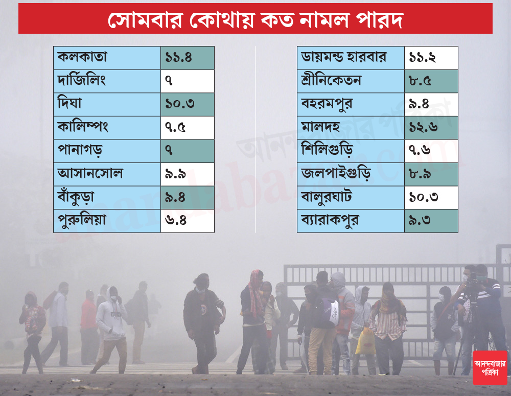 আলিপুর আবহাওয়া দফতর সূত্রে খবর, কলকাতার সর্বনিম্ন তাপমাত্রা ১১.৪ ডিগ্রি সেলসিয়াস। স্বাভাবিকের থেকে ৪ ডিগ্রি কম। সর্বোচ্চ তাপমাত্রাও স্বাভাবিকের থেকে ৪ ডিগ্রি কমেছে। ফলে সকাল বেলাতেও শহরে শীতের দাপট ভালই মালুম হচ্ছে। বড়দিনের আগে শীত পড়ায় চিড়িয়াখানা, নিকো পার্ক, ইকো পার্ক, সায়েন্স সিটি-সহ দর্শনীয়স্থানগুলিতে উপচে পড়ছে ভিড়। ময়দানে চত্বরে ইতিউতি চড়ুইভাতির ছবিও ধরা পড়ছে। পার্ক স্ট্রিট, সদর স্ট্রিট এলাকায় বিদেশি পর্যটকদের আনাগোনাও বেড়ে গিয়েছে।