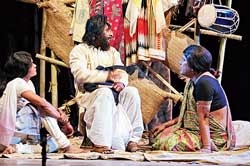 ঘর হারিয়ে, রোজের উপেক্ষা-তাচ্ছিল্য-ঘেন্নার সঙ্গে বড় হতে হতে যারা ভুলতে বসেছে নিজেদের মানুষ নামের পরিচয়টা। মাঝেমধ্যে বিবেক-জাগানিয়া বাঁশিতে ফুঁ দিয়ে আসেন ফুলুটবাবু, আরও বেশি আসে গুন্ডা গোলাপ, মাতাল রঘু। লড়াই আর আপসে মেশানো হিজড়ে জনগোষ্ঠীর জীবনকে মঞ্চে এনেছে বহরমপুরের নাট্যদল রঙ্গাশ্রম, তাদের ‘সন্তাপ’ নাটকে। সন্দীপ ভট্টাচার্য অভিনীত-নির্দেশিত নাটকটির সাম্প্রতিক অভিনয় হয়ে গেল জ্ঞান মঞ্চে। সঙ্গী প্রত্যয় জেন্ডার ট্রাস্ট, রূপান্তরকামীদের যৌনতা, লিঙ্গ পরিচয় ও অধিকার নিয়ে যারা কাজ করছে দীর্ঘ দিন। সঙ্গে সেই নাটকের একটি দৃশ্য।