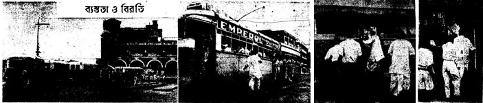 (বাম দিক হইতে) ১. বুধবার হাওড়া স্টেশনে—বাসের ভিড় আছে, কিন্তু যাত্রী কম। ২. সকালে সার্কুলার রোডের ট্রামে অফিস যাত্রী।