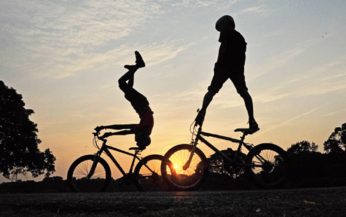 কসরত। মঙ্গলবার, কলকাতা ময়দানে। ছবি: সুদীপ্ত ভৌমিক।