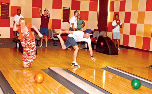 স্বাদ বদল। অন্য বোলিং-এ সস্ত্রীক ব্র্যাড হগ। মঙ্গলবার, বৈদিক ভিলেজে। ছবি: শৌভিক দে।