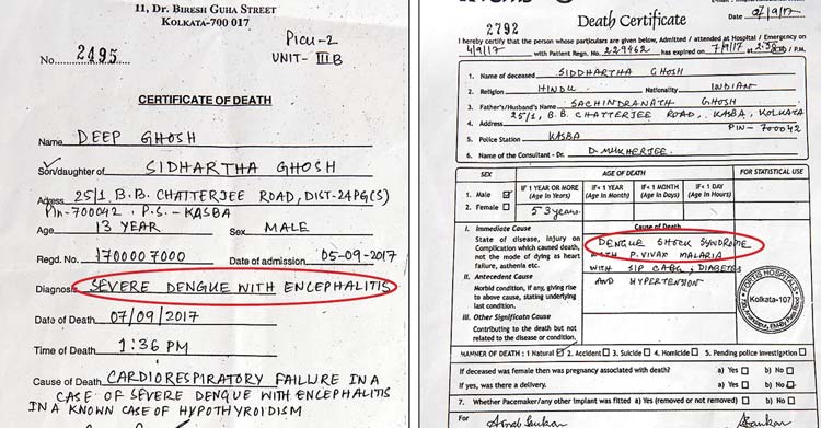 দুই হাসপাতালের দেওয়া দু’জনের ডেথ সার্টিফিকেট। যাতে বলা হয়েছে, মৃত্যুর কারণ ডেঙ্গি।