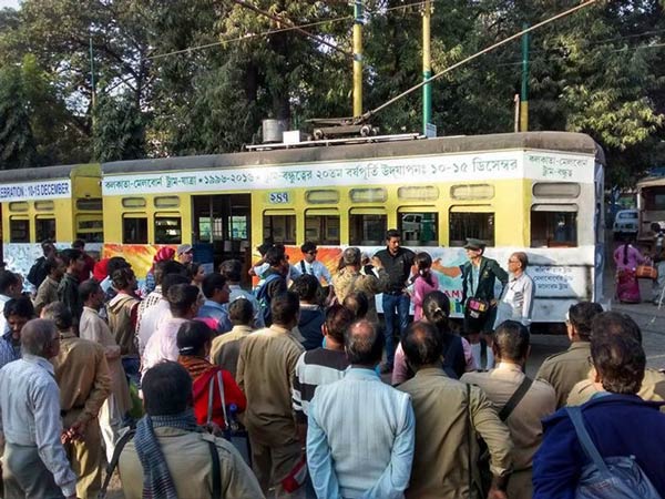 চলতি বছরে কুড়িতে পা দিল ‘ট্রাম যাত্রা’। চলবে ১৭ ডিসেম্বর পর্যন্ত। নোনাপুকুর ট্রাম ডিপো থেকে শুরু হয়ে এসপ্ল্যানেড, কখনও গড়িয়াহাট, কখনও বা উত্তর কলকাতার হাতিবাগানে। এ বছরে ট্রাম সাজানো হয়েছে এক নতুন থিমে— ‘পরিবেশবন্ধু ট্রাম’। এতে দূষণমুক্ত পরিবেশের কথা তুলে ধরা হয়েছে। তবে এ প্রজন্মে ট্রামপ্রেমীর সংখ্যা যে হাতেগোনা, তা বলাই যায়। তাই এ বারের ট্রাম যাত্রায় নতুন সংযোজনা— ‘ট্রাম থিয়েটার’। অভিনয়ে ‘হোল নাইন ইয়ার্ডস’ নাট্যদল। সঙ্গে রয়েছেন রবার্তোও। ট্রাম সাজানোও হয়েছে গত কুড়ি বছরের পাল্টে যাওয়া কলকাতার পোস্টারে। নয়া রং লেগেছে ডব্লিউবিটিসি-র ২৪৭ নম্বর ট্রামটির গায়ে।