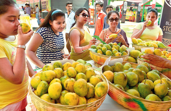 আম-বাঙালি। স্বাদ আর গন্ধে মাতোয়ারা করতে শুধুই আম নিয়ে ‘আমন্ত্রণ’। শনিবার, যোধপুর পার্কে। ছবি: শুভাশিস ভট্টাচার্য