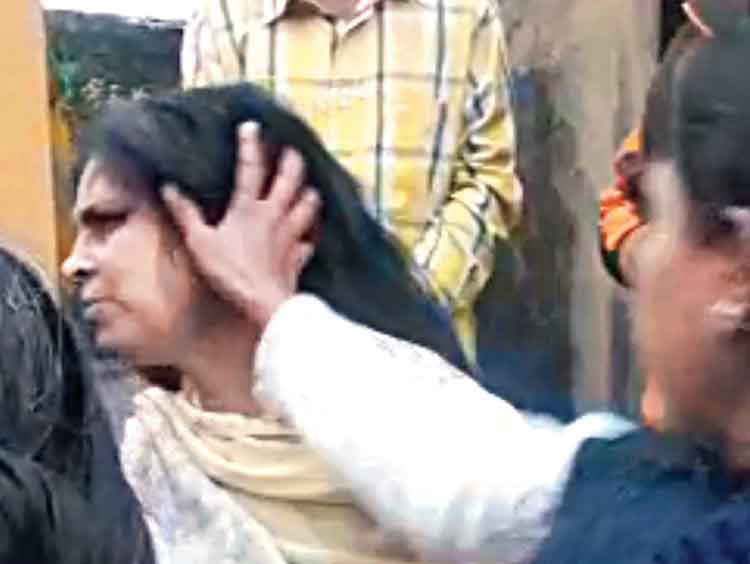 মৃতার দিদি কেয়াদেবীকে মারধর করেন কিছু স্থানীয় বাসিন্দা। বুধবার, বেহালায়। —নিজস্ব চিত্র।
