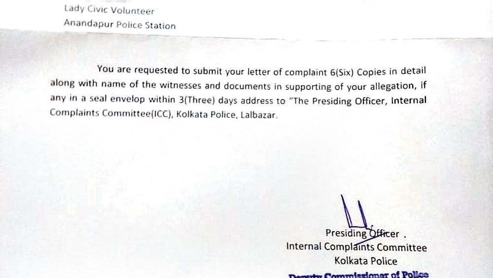 কলকাতা পুলিশের তরফে এ নিয়ে মন্তব্য করতে চাননি কেউই। তবে লালবাজারের যুগ্ম কমিশনার পদের এক কর্তা জানান, কলকাতা পুলিশের অভিযোগ সংক্রান্ত সেল-এ বিষয়টি পাঠানো হয়েছে। অভিযোগকারিণীকে লালবাজারে ডেকে দু’দিন কথা বলা হয়েছে। এর পরে গত বুধবারই লালবাজারের অভ্যন্তরীণ অভিযোগ কমিটির (আইসিসি) তরফে তার প্রধান তথা স্পেশাল টাস্ক ফোর্সের ডেপুটি কমিশনার অভিযোগকারিণীকে একটি চিঠি পাঠিয়ে অভিযোগপত্রের ছ’টি প্রতিলিপি ও ঘটনার প্রত্যক্ষদর্শীদের নাম জমা করতে বলেছেন।