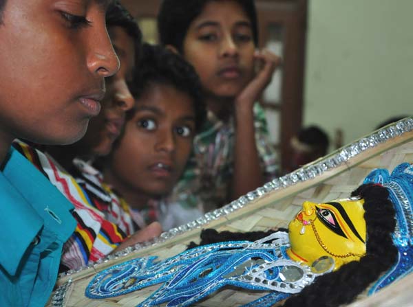 পুজোর কয়েকটা দিন কচিকাঁচাদের সঙ্গেই সময় কাটায় ছাত্ররা।ছবি: মহারাজা মণীন্দ্রচন্দ্র কলেজের ফেসবুক থেকে।