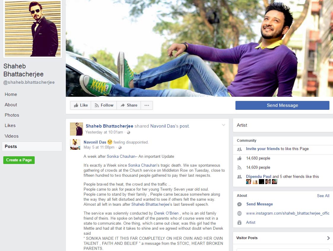 এই ‘জাস্টিস ফর সোনিকা’ পেজে আপলোড হওয়া ছবি এবং পোস্টগুলো সোনিকার বিশেষ বন্ধু সাহেব ভট্টাচার্য শেয়ার করছেন নিজের ফেসবুক ওয়ালে। সে বিষয়ে যদিও তিনি একেবারেই মুখ খুলতে চাননি। এই প্রোফাইলটি কি তিনিই মেনটেন করেন? এ নিয়েও কোনও কথা বলতে চাননি সাহেব। সাহেবের আর একটি প্রোফাইলে সোনিকার সঙ্গে নিজের ছবি পোস্ট করেছেন তিনি। তবে সেখানে বিক্রম সম্পর্কে প্রশ্ন তোলা ‘জাস্টিস ফর সোনিকা’ হ্যাশট্যাগ দেওয়া পোস্টগুলির কোনও শেয়ার হয়নি। রবিবার সাহেব আনন্দবাজারকে শুধু বলেন, ‘‘তদন্তেই সব উঠে আসবে। তার আগে কিছু বলতে চাই না। তবে সোনিকার মৃত্যুর পরেও ওর বন্ধুরা ওর পাশে আছে। এই বিষয়ে আর কিছু বলার মতো অবস্থায় আমি নেই।’’