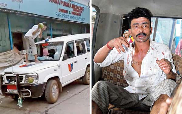 (বাঁ দিক থেকে) ডাবের খোলা দিয়ে চলছে গাড়ির কাচ ভাঙা। থানার পথে সুজিত। সোমবার।