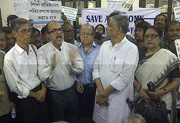 বিশ্ববিদ্যালয়ের ফিনান্স অফিসার হরিসাধন ঘোষকে সাসপেন্ড করার প্রতিবাদে বিশ্ববিদ্যালয়ে শিক্ষকদের সংগঠন (কুটা) উপাচার্যের ঘরের সামনে একটি অবস্থান বিক্ষোভের কর্মসূচি নিয়েছিল। কর্মসূচি শুরু হওয়ার কথা ছিল বেলা ১২টায়। অভিযোগ, কুটা-র সদস্যেরা এসে দেখেন, ওই জায়গায় বসে আছে টিএমসিপি সমর্থকদের সঙ্গে কয়েক জন বহিরাগতও। কুটা-র প্রতিনিধিরা তাদের উঠে যেতে বলায় দু’পক্ষের মধ্যে শুরু হয় বাগবিতন্ডা। এই সময়েই কয়েক জন কুটা-র সদস্যদের গায়ে হাত তোলে বলে অভিযোগ। এর পর সংবাদমাধ্যমের প্রতিনিধিদের সামনেই কুটা-র সাধারণ সম্পাদক লাইব্রেরি সায়েন্সের প্রধান দিব্যেন্দু পালকে ঘিরে ধরা হয়। ভিড়ের মধ্যে ধস্তাধস্তি শুরু হয়ে যায়। যদিও এই ঘটনায় পুলিশে অভিযোগ দায়ের করেনি কুটা। তবে তাঁরা প্রতিবাদ চালিয়ে যাবেন।
