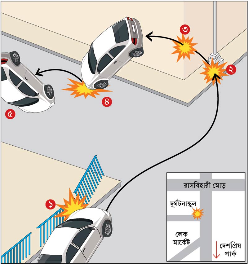গড়িয়াহাটের দিক থেকে রাসবিহারী অ্যাভিনিউ ধরে এসে প্রথম ধাক্কা ফুটপাথের ধারের রেলিংয়ে।