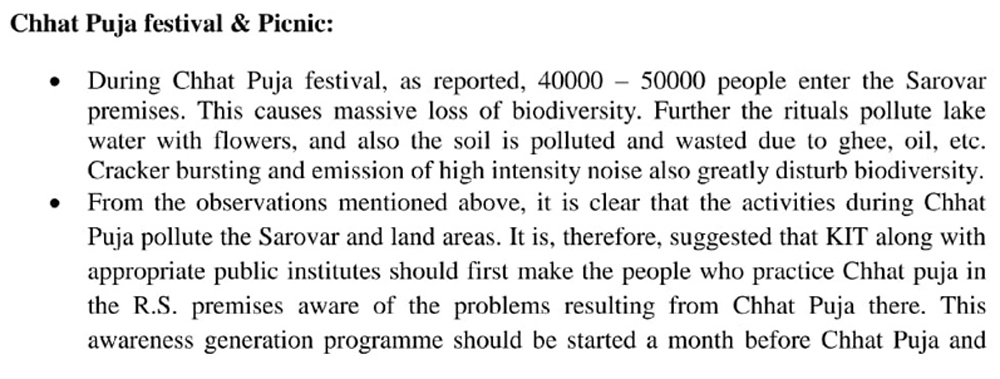 তার পরের বছরই অর্থাৎ, ২০১৭ সালে আট জনের আরও একটি কমিটি রবীন্দ্র সরোবরের একটি র্যাপিড ‘ইআইএ’ করেছিল। খেলা, পিকনিক, অন্য কারণে জনসমাগম-সহ বিভিন্ন কর্মকাণ্ডে সরোবরের পরিবেশের উপরে কী প্রভাব পড়বে, তা উল্লেখের পাশাপাশি রাজ্য দূষণ নিয়ন্ত্রণ পর্ষদের তরফে সে বছরের জুনে প্রকাশিত ওই চূড়ান্ত রিপোর্টে বলা হয়েছিল,— ‘ছটপুজোর কারণে ৪০-৫০ হাজার মানুষ রবীন্দ্র সরোবরে প্রবেশ করেন। তার ফলে সেখানকার জীববৈচিত্র মারাত্মক ক্ষতিগ্রস্ত হয়।’ তা ছাড়া ছটপুজোয় সরোবরের জলই যে শুধু দূষিত হয়, তা নয়। পুজোয় ব্যবহৃত ঘি, তেলের কারণে সেখানকার মাটিও দূষিত হয়। সংশ্লিষ্ট সমীক্ষায় তাই সুপারিশ করা হয়েছিল, সরোবরের পরিবর্তে অন্যত্র ছটপুজো করার বিষয়ে পুণ্যার্থীদের মধ্যে সচেতনতা ও উৎসাহ তৈরির জন্য।