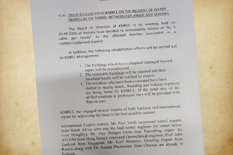 প্রেস রিলিজ জারি করে এ দিন মেট্রো জানিয়েছে, এ দিন কেএমআরসিএল-এর বোর্ড অব ডিরেক্টরসরা বৈঠক করেন। তাতে সিদ্ধান্ত হয়েছে, প্রতিটি পরিবারকে যত তাড়াতাড়ি সম্ভব ৫ লক্ষ টাকা করে দেওয়া হবে। যাদের বাড়ি ভেঙে গিয়েছে, তাদের বাড়ি তৈরি করে দেওয়া হবে। ক্ষতিগ্রস্ত বা়ড়ি সারিয়ে দেওয়া হবে। সে জন্যে বাড়ির স্বাস্থ্য পরীক্ষা করে প্রয়োজনীয় পদক্ষেপ নেওয়া হবে। আপতত থাকা-খাওয়ার বন্দোবস্ত করা হবে।
