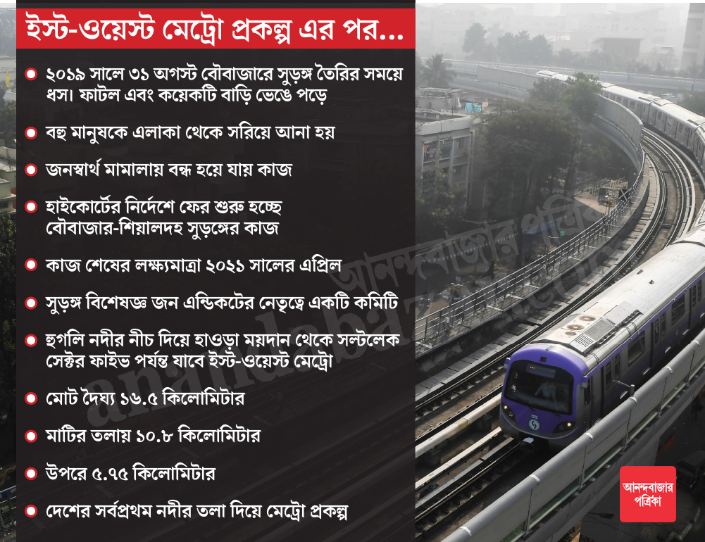 সুড়ঙ্গ বিপর্যয়ের পর বৌবাজার থেকে শিয়ালদহ পর্যন্ত ইস্ট-ওয়েস্ট মেট্রো প্রকল্পের কাজ থমকে গিয়েছিল। সম্প্রতি কলকাতা হাইকোর্ট কাজ শুরু করার অনুমতি দিয়েছে। আদালতের ছাড়পত্র মেলার পরই দ্রুত প্রকল্প শেষ করতে চাইছে কলকাতা মেট্রো রেলওয়ে কর্পোরেশন লিমিটেড (কেএমআরসিএল)। বিপর্যয়ের কথা মাথায় রেখে, বৌবাজারের বাসিন্দাদের সঙ্গে নিয়মিত যোগাযোগ রাখা থেকে শুরু করে সব ধরনের প্রয়োজনীয় পদক্ষেপও করা হচ্ছে বলে জানিয়েছেন মেট্রো আধিকারিকেরা। বৌবাজার এলাকার বাসিন্দাদের উদ্দেশে মেট্রোর বার্তা, ভয় পাওয়ার আর কোনও কারণ নেই। অত্যন্ত সাবধানতার সঙ্গে সুড়ঙ্গ খোঁড়ার কাজ চলবে।