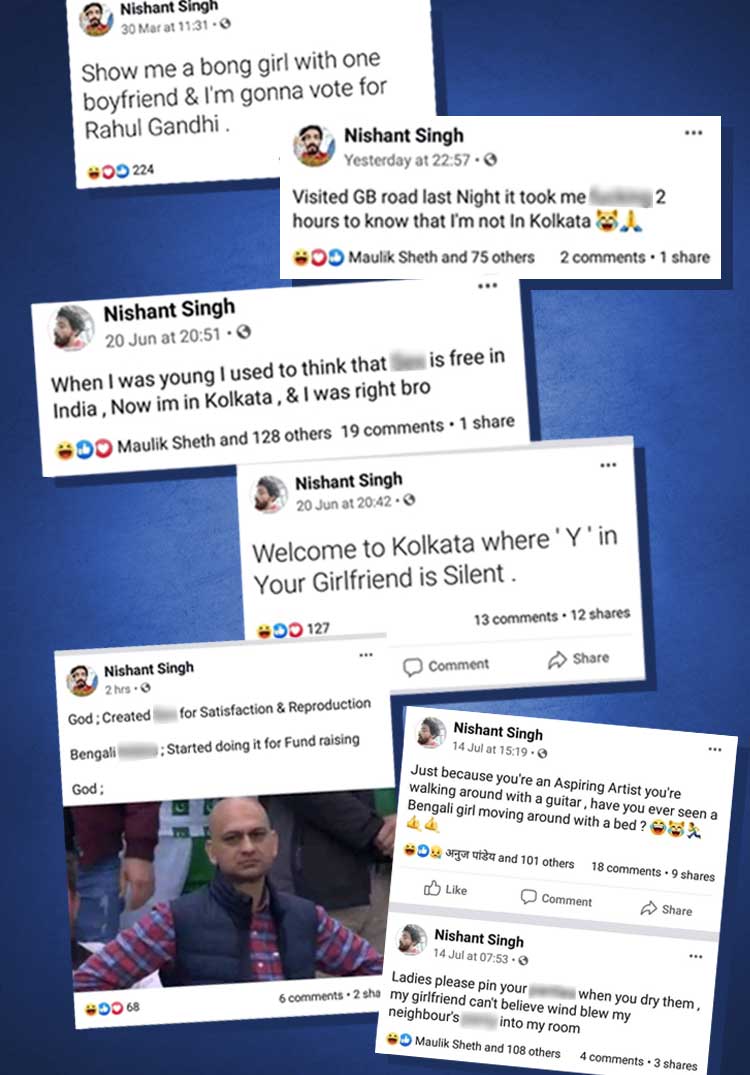 ফেসবুকে একের পর এক নারীবিদ্বেষী পোস্ট। বাঙালি মেয়েদের উদ্দেশে যৌন ইঙ্গিতপূর্ণ কুরুচিকর মন্তব্য ও আক্রমণ করে নেটিজেনদের তোপের মুখে পড়লেন নিশান্ত সিংহ নামের এক যুবক। ফেসবুক প্রোফাইল অনুসারে, নিশান্ত সিংহ নামে দিল্লির ওই যুবক কর্মসূত্রে থাকেন কলকাতায়। তিনি ইনফোসিসে কাজ করেন বলেও উল্লেখ রয়েছে তাঁর ফেসবুক প্রোফাইলে।