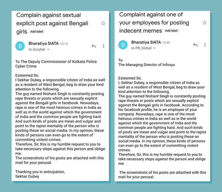 নিশান্তের বিরুদ্ধে অভিযোগকারীদের অন্যতম শেখর দুবে বলেছেন, ‘‘ডেঙ্গু হওয়ায় আমি বাড়িতে। তাই ইমেলের মাধ্যমে ইতিমধ্যেই আমি ইসফোসিস, কলকাতা পুলিশ ও দিল্লি পুলিশের সাইবার ক্রাইম বিভাগে অভিযোগ জানিয়েছি।’’ তবে শেখর একা নন, তাঁর অনেক বন্ধু-সহ প্রায় দেড়শো জন নিশান্তের বিরুদ্ধে অভিযোগ জানিয়ে ইমেল করেছেন পুলিশে কাছে।